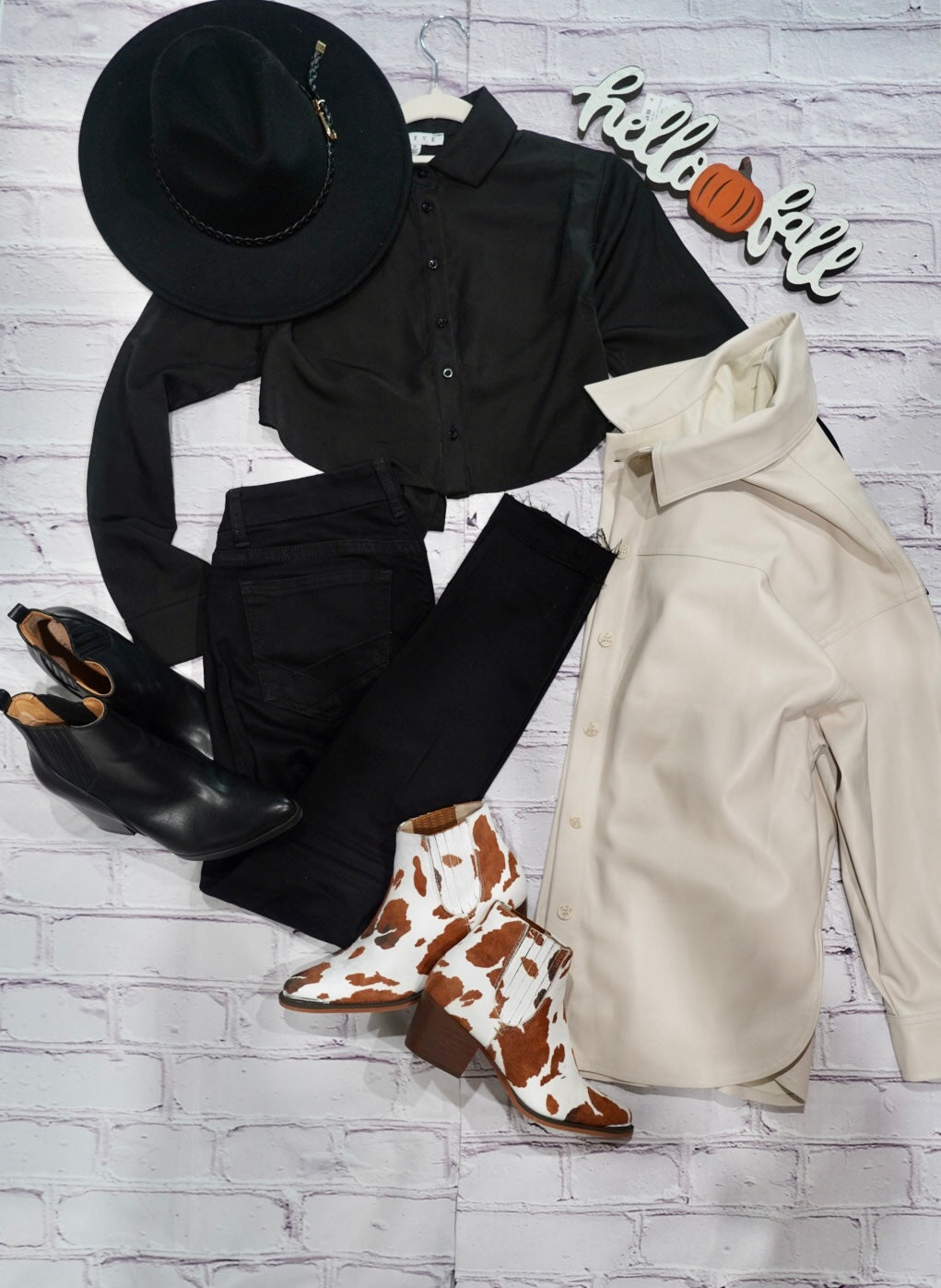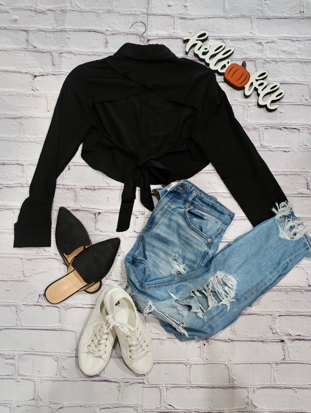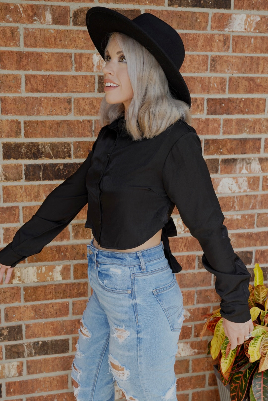This top is sure to be business in the font and party in the back! It's ready for a cool fall! Featuring a collared neckline and long sleeves. This top has a button-front design with a crop hem. The backless bodice with cross straps will add a sultry touch to your look. This shirt is ready for the office with a cardigan, casual day out, or a fun and flirty night out!